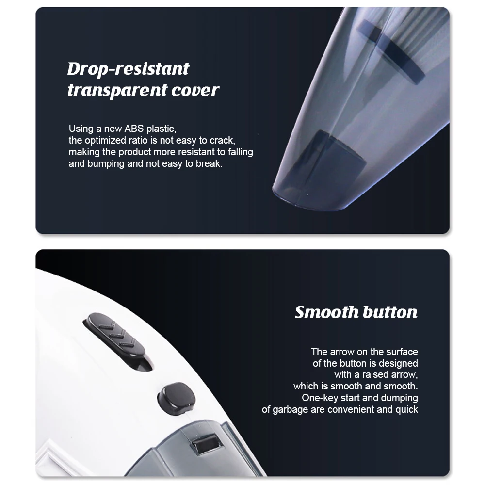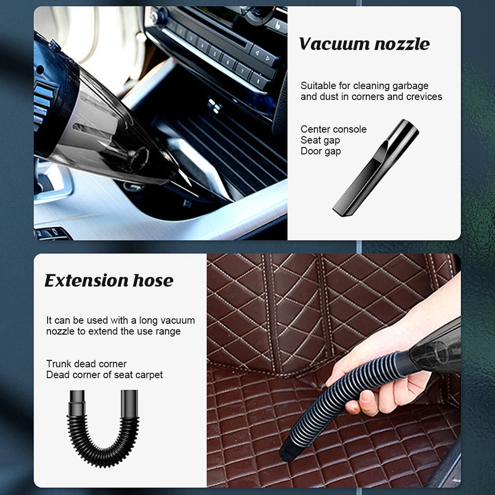 Strong Suction: It is a 12-volt 120W 6000 pa high suction power vacuum with a high-performance motor provides superior suction capability in a compact size and will absorb all kinds of dusty.